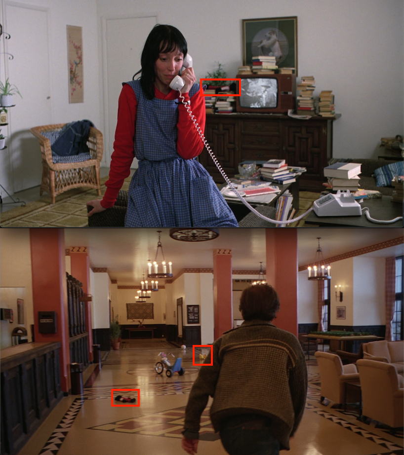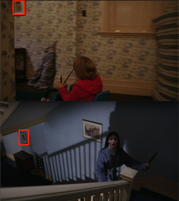 When Jack is stalking to the spot where he’ll hide to kill Hallorann, he passes two Oxborough paintings of Bearspaw kids (4th image below) and a photo (2nd image below) which is only seen in one other place, which is when Wendy’s on the second floor. On the second floor of her climb, Wendy passes two of her own Oxboroughs, neither of which are the same as the ones from the lobby stalk, but hung in a similar eyes-shape pattern. All of these Oxboroughs appear at other points in the hotel except the one I double-boxed. Not sure if that’s significant.