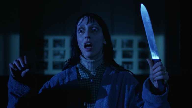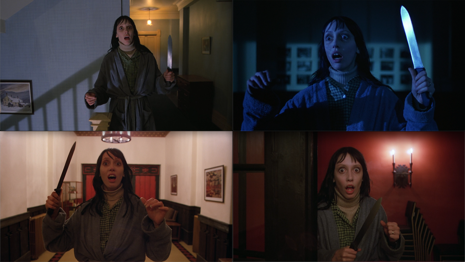 And what’s the order of Wendy’s horrors? The blowjob bear (light blue), dead Hallorann and the Grady ghost (light red), the skeleton ball (dark blue), and the bloodfall (dark red). Note too that the blue scenes feature a left-handed knife, and the red scenes feature a right-handed knife.