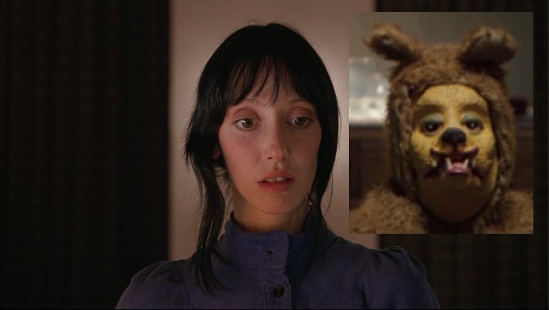 Doesn’t its pronounced, globular, make-upped eyelids and large, dulcet irises look like a sly nod at Shelley Duvall’s natural features. Wendy is compared several times, as I’ve discussed elsewhere, to Winnie-the-Pooh, so this Pooh bear-toned mask would seem to be another wink in that direction.