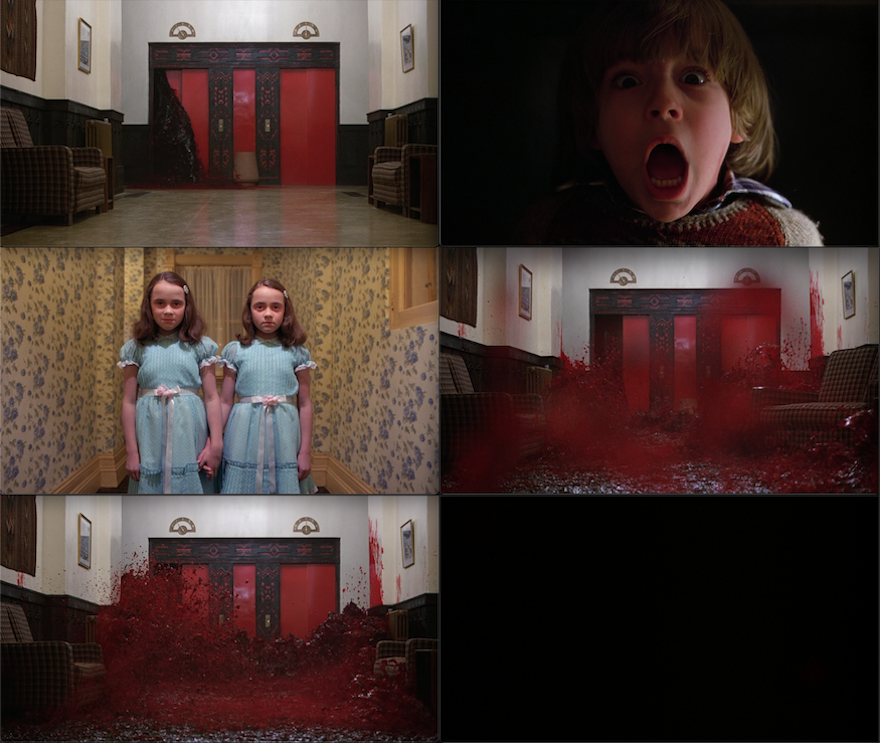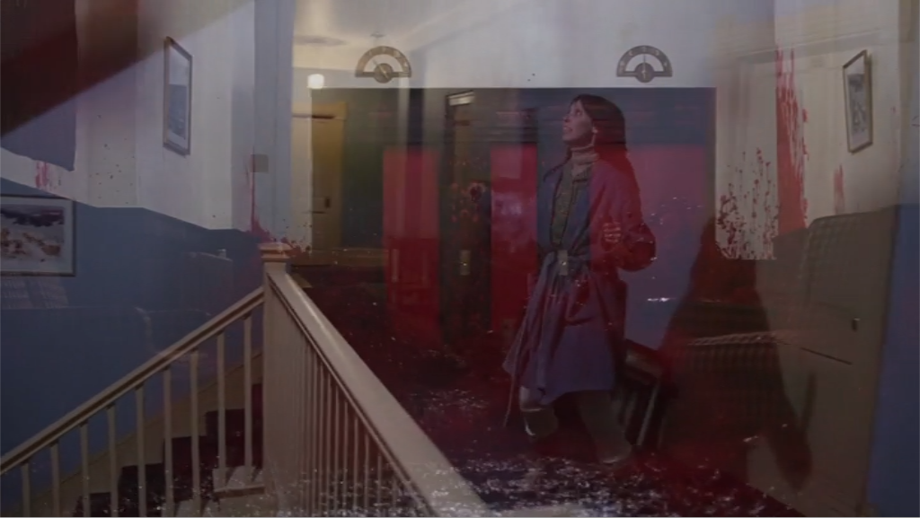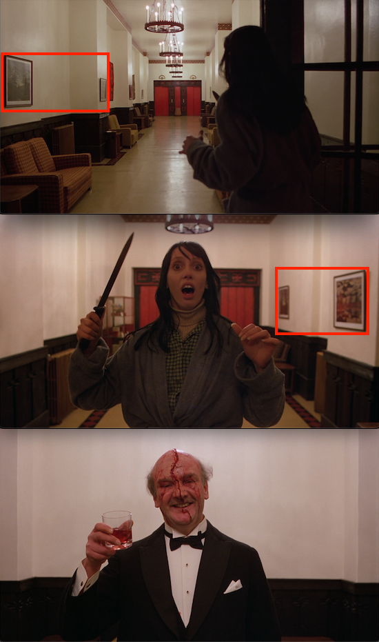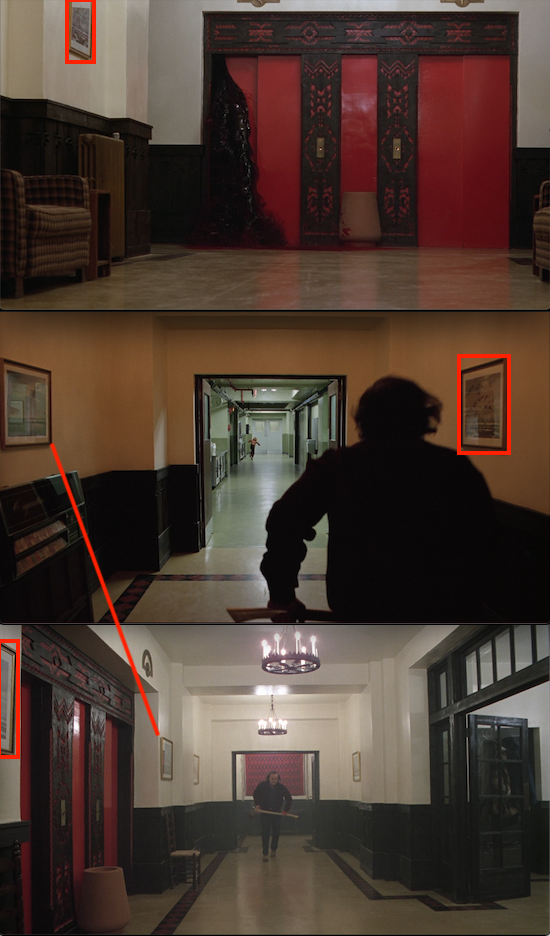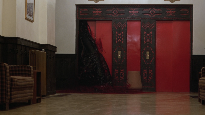 Ah, except the bloodfall doors aren’t doors, but an elevator. Wendy is standing at some glass doors, opposite an elevator. So the art then acts to let us know that it’s as if she’s running back into the Grady ghost hall. Which means that when the bloodfall starts falling, it’s as if it’s falling on Charles Grady. Which is possibly why Kubrick decided only to let us know he was the real Charles Grady through all the buried clues. Because part of the horror of the bloodfall is in its anonymity. This is all the blood of all the forgotten dead who’ve ever lived, loved, and laughed.