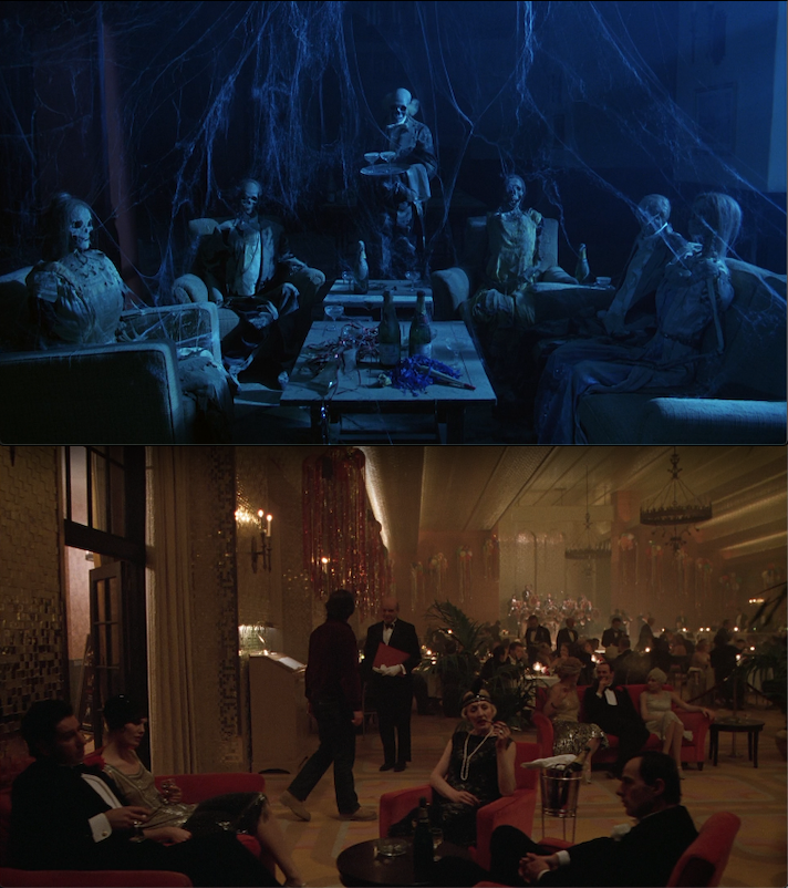 The photo next to his head here is the one that will be hanging right behind where Wendy’s standing here, along with photo Jack’s photo, in the last shot of the film. In this photo, a bunch of wealthy people sit around dinner tables. In photo Jack’s photo, a sprawling sea of partiers celebrate American independence. There’s not a trace of famine about these photos, but they’re really illusions of abundance. They make the hotel seem full of souls and faces, just like the ghost ball does, but they’re empty mental calories. They do nothing to stave off the madness of starvation. That’s what Wendy’s seeing when she sees the skeleton ball. The horrifying irony of the starved-to-death poised in acts of empty abundance.