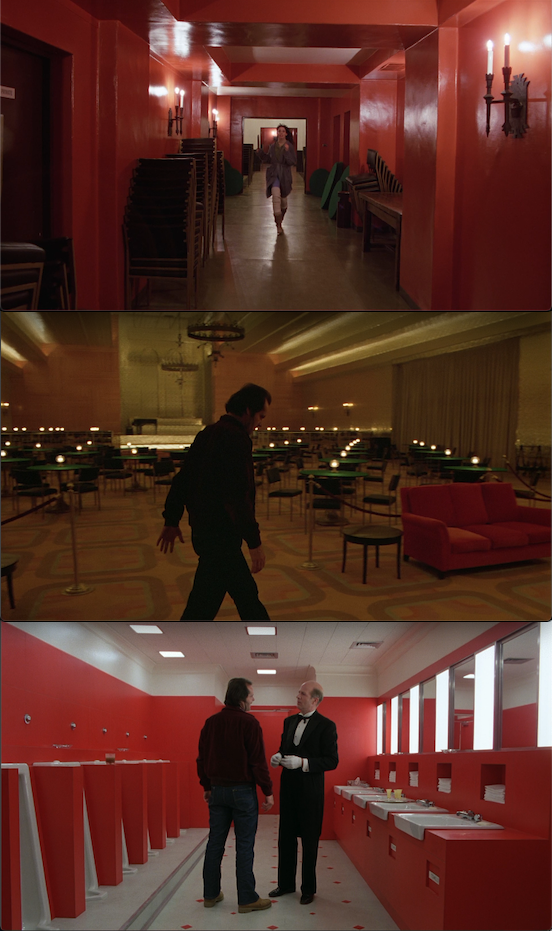 Oh, and note how in the reverse shot for both of these scenes we get a straight-white wall with dark brown wood and red accents, and a straight-red wall with dark brown wood and white accents.