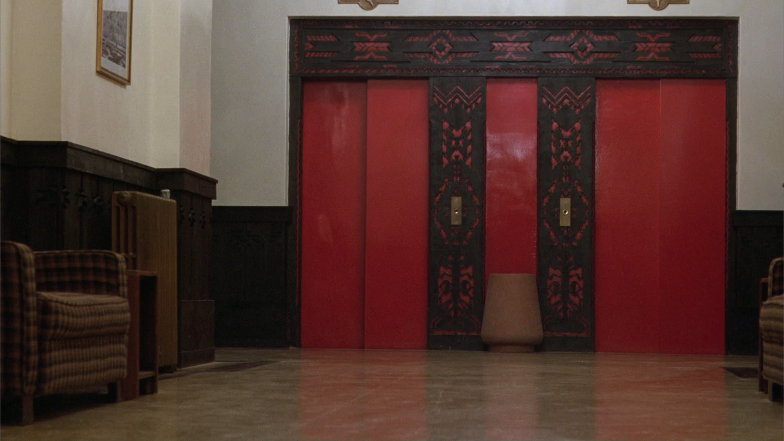 I’m not exactly sure why it does this, but it jumps from left, to right, to left, in the moments we see it (there are three instances of characters seen in this hallway shot from the other direction, which would put it on the left each time, but it’s never in frame). In both instances with an elevator, it’s to the left…