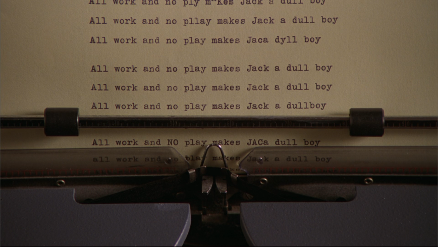 So perhaps Kubrick’s making the same reference Henry James was making, but I wonder if he’s sympathetic to the bible’s words. Perhaps Jack’s typewriter is first white because it’s innocent in the sense that Jack hasn’t written anything on it yet, so it hasn’t become a tool of his vanity. And the silvery-grey typewriter’s “All work and no play makes Jack a dull boy” papers…are pretty vain. A waste of time and paper, if nothing else.