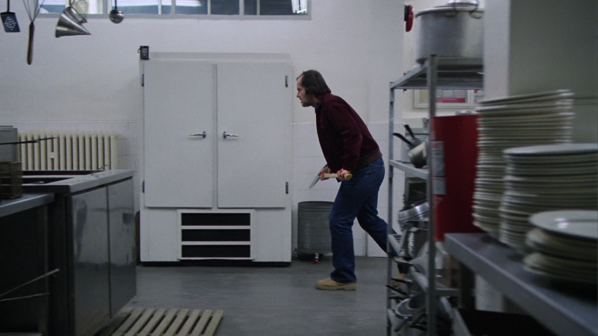 …and the second sits on a large steel table in the kitchen that will disappear later, so that Wendy can drag Jack through the same space and lock him up, and so that a Grady-released Jack can stalk through for Hallorann killing purposes (bible scholars should know where I’m going with this by now).