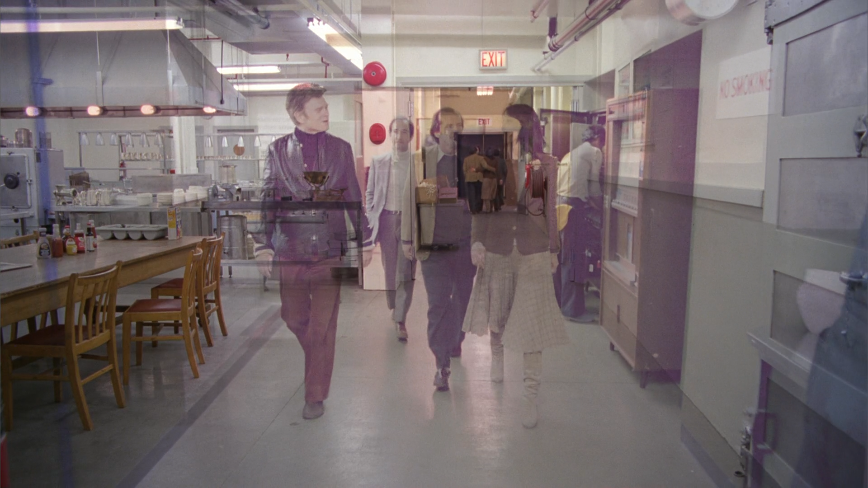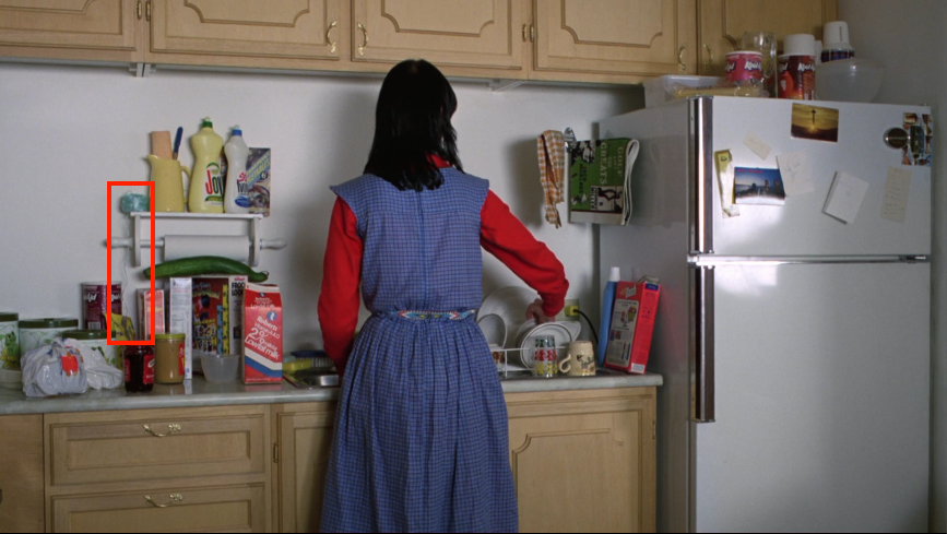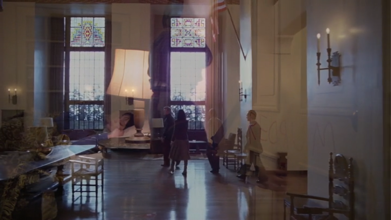 There’s even this amazing moment where both prior golden bowl locations are connected through the below crossfade. Note how the location of the lounge golden bowl is obscured by the large iron chandelier, and how the location of the kitchen golden bowl is obscured by the wonky angle of this shot. In other words, it takes a deal of close scrutiny to know that Wendy is dragging Jack through that spot, and that there was ever anything there in the first place.