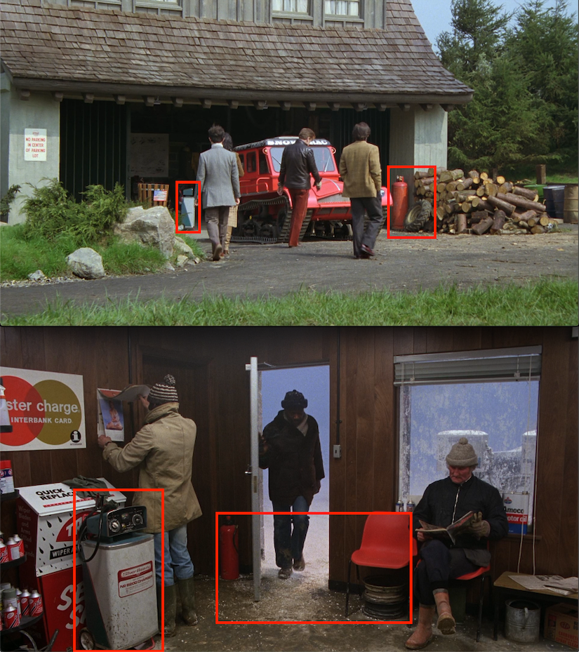 …and a possibly broken wheel beside a red tank of some kind in two locales (the portable electric charger seen at both the film’s garages is called a Silver Beauty).