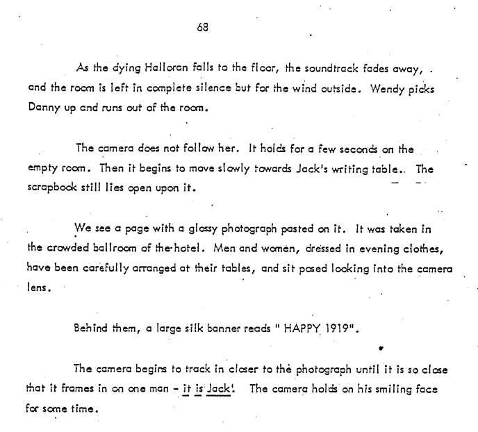 Hallorann was just grilling Danny to remember what Tony told him about the Overlook, and right on the fade between the two gold bowl locations, Danny breaks from the conversational stream to ask, “Mr. Hallorann, are you scared of this place?” Of course, if Danny had kept thinking, he might’ve remembered that one of his visions was of himself screaming in the dark, which later turns out to be the face Danny makes when Hallorann is killed. So, in a way, Tony’s visions were vain. It’s not the visions that save Danny from his potential murder, it’s the pattern recognition inherent in the Lessons and Escapes. Still, he had a (very abstract) chance to warn Hallorann about his prognosticated demise. Had he done so, maybe Hallorann would’ve thought a little harder about whether saving this family was worth his own life…and maybe that would’ve lead to another Grady-style familicide. (Oh man, I’m not going to take the time to ponder what this means, but in the months since I first wrote this, I discovered a copy of Kubrick’s original treatment for the story, and in it, a Grady-possessed(?) Hallorann becomes the villain after Wendy successfully stabs Jack to death (scroll down to page 66). This would be the best explanation for the account that Kubrick wanted Slim Pickens to play the elderly black chef, Dick Hallorann. Pickens was consecrated into cinematic memory by Kubrick, thanks to the shot of Pickens riding the nuclear warhead into the ground as Maj. “King” Kong in Dr. Strangelove. So maybe having him fail to destroy the Torrances was supposed to act as a reflection of how he essentially ends the world in the earlier film. Note how Pickens was born in 1919, and in the treatment, the year photo Jack is trapped in forever was for 1919 (see below). Coincidence?)