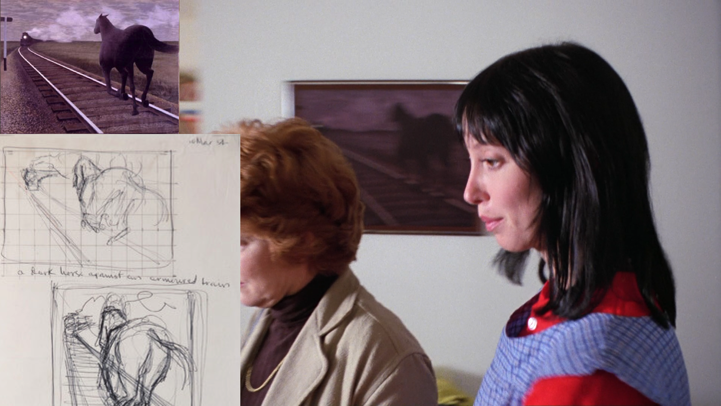 The painting was also used as the cover art for Bruce Cockburn’s 1973 album Night Vision. Danny has just had a day vision of the future. The album has a few tracks with names that feel applicable to moments from the film, but especially track 8, Déjà Vu. And while we hadn’t seen this painting, or this angle of the apartment before, Colville experts might’ve had a moment of déjà vu seeing two of his works exactly 200 seconds apart, in what will turn out to be opposite walls from each other. Or perhaps our déjà vu was in seeing the little children knitting 150 seconds after seeing the Grady twins. Or, you know, the dozens of other dualities in this beast.