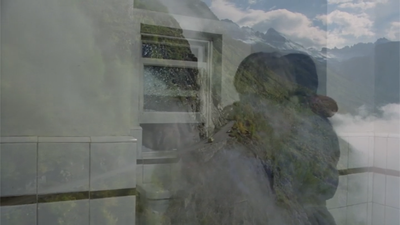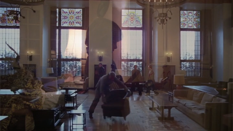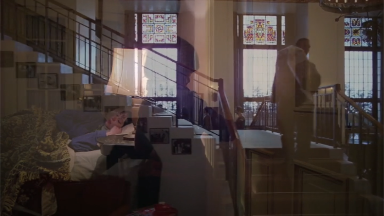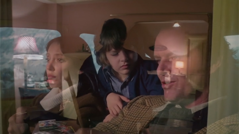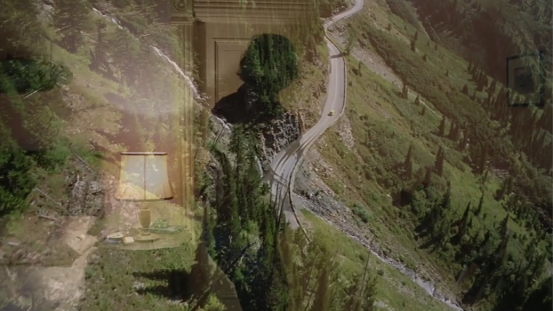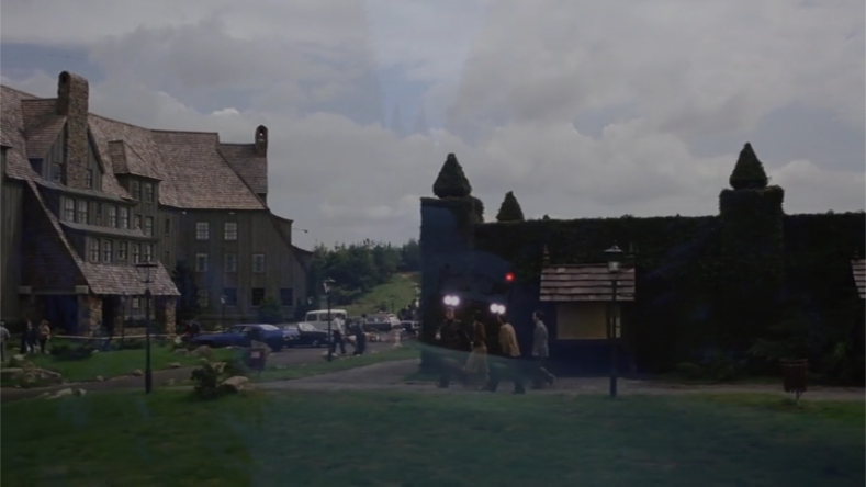 - Also, note the way Hallorann’s headlights are almost always touching, or very near Ullman. During the whole labyrinth walk, Dick’s snowcat seems to be bearing down on the figure of Ullman, just like the Austin Maxi does in the third image below. And notice the way the tree line above Dick’s snowcat, in the second, third and fourth images below, looks like a blue wave pouring down on Ullman (John), then Wendy (Ringo? Why on Ringo? Because of Octopus’s Garden?). Remember that Hallorann is Yoko, so this could be Yoko’s love flood. It’s pouring down first from the sky, and then from the Overlook. Which is where the bloodfall is sloshing around, waiting to be de-elevatored.