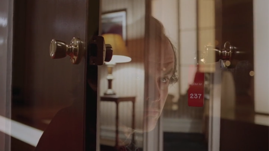 - “I want you” – On “want” we get the first image below. And on “you” we get the second. This is one of my favourite instances of synchronicities, because it just feels like we’ve passed through a revolving door: Wendy becomes Hallorann, Jack becomes Lloyd. The tonal shift in these songs helps this effect a lot, but just the mirrorform on its own has that feeling. (And the film itself is about to put us through three different looking glasses: Jack is talking to a ghost like he’s always known him, Hallorann is about to receive a massive shine from thousands of kilometres away, and another ghost is about to reveal a power we didn’t know Overlook ghosts have: the ability to wound.)