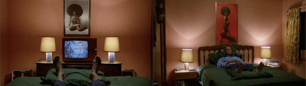 The Aarne-Thompson system lists it as ATU 333, which I don’t think has especial significance to the fable, but it made me think about how almost everything to do with Hallorann comes in threes. When we first meet him, we get three scenes: meeting him in the Gold Room, the tour of the Kitchen, and then the shining talk with Danny. His next scene, which happens to be the middle scene of the movie, is the most singular instance with Hallorann, where everything is more about symmetry and twos (two shots of him in bed, two shots of the TV, two nudes, two album collections, two nightstands, a room full of rough symmetry).