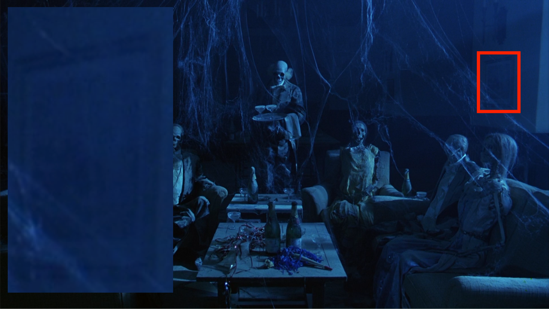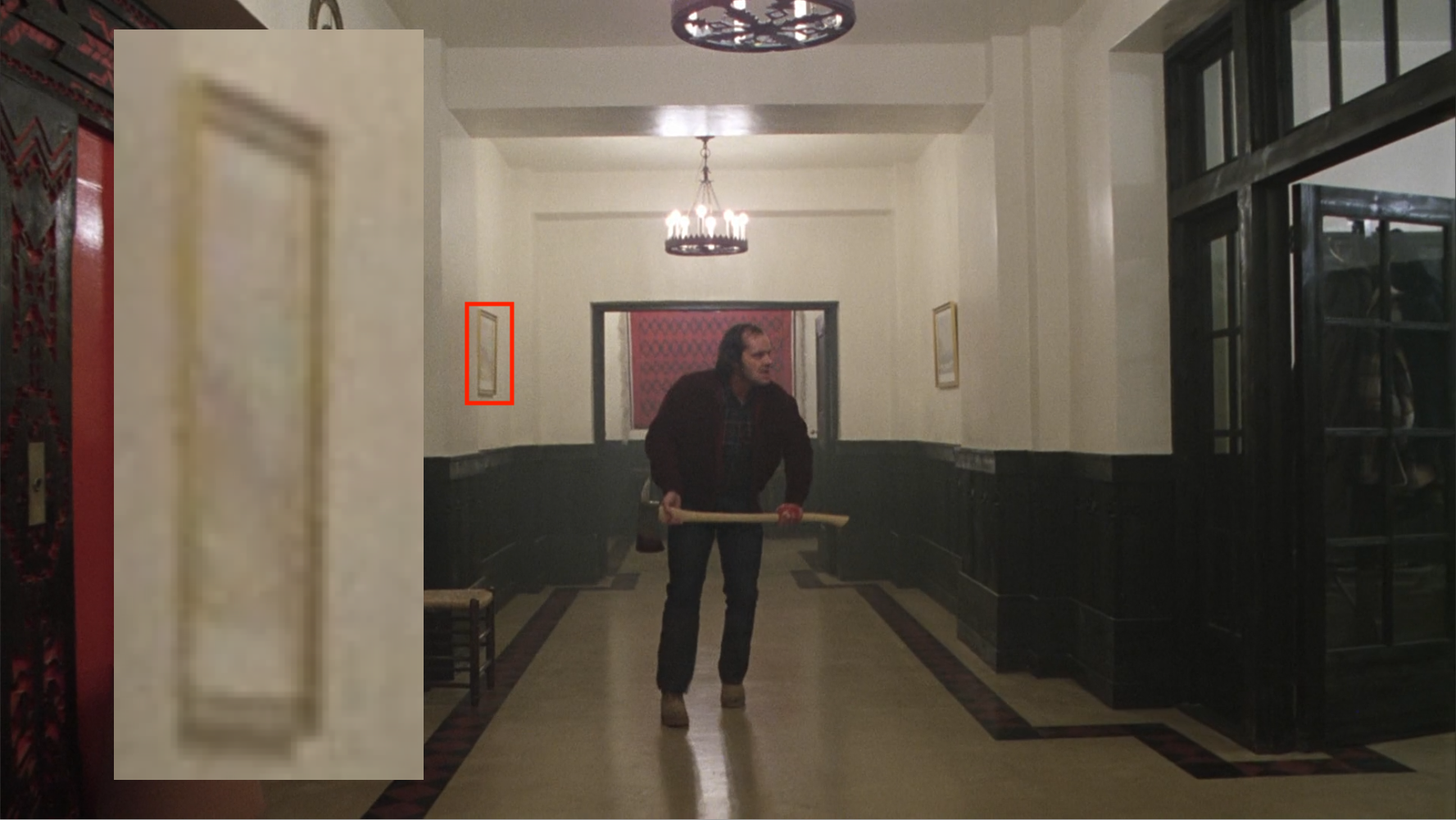 Weirdly, in the first Wendy-free shot of the skeleton ball the Krieghoff has vanished, leaving only Group of Sevens. You can also see in this shot the spot where Hallorann’s corpse should be, but has also vanished.