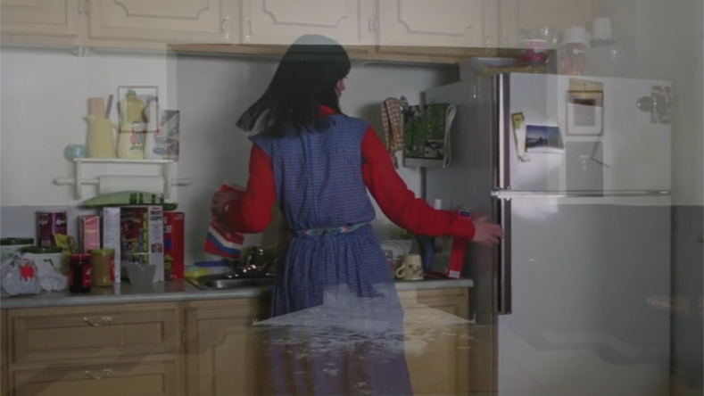 - “But when she turns her back on the boy, he creeps up from behind” – On “the boy” Wendy checks behind herself, looking away from the spot where Grady ghost is about to appear. And on “creeps” forward Jack’s listening face reappears. And a moment later, we see the wreckage from Jack’s earlier tantrum behind Wendy. All the spilled bowls and disks.