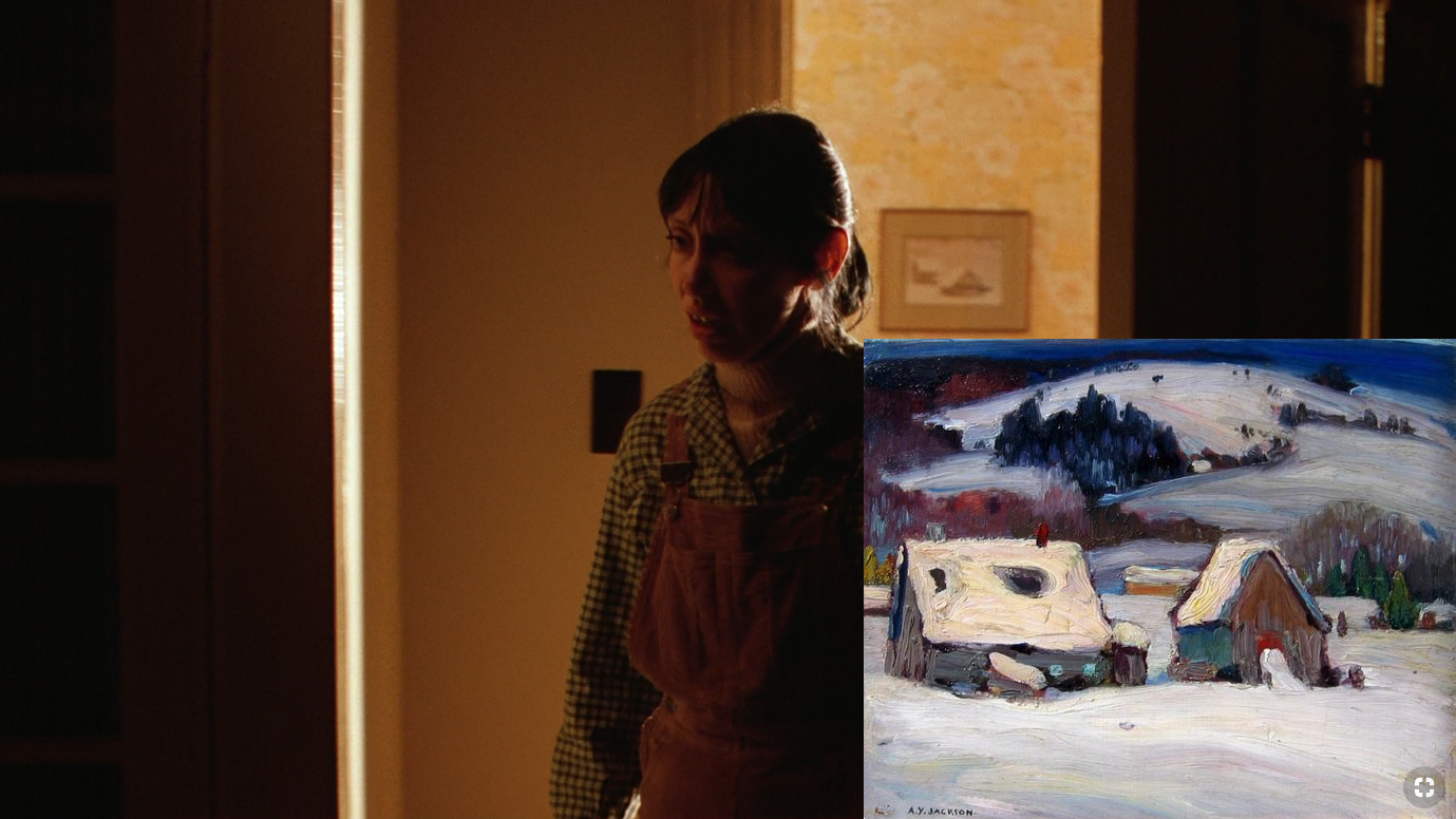 Then there’s the final picture of the two snowy cabins together which hangs outside Danny’s room. The mirrorform action for this moment is Wendy telling the bashful ranger “I suppose not. Over.” in response to his question, “Is there anything else I can do for you, Mrs. Torrance? Over.” So perhaps this painting will speak to the seeming futility of Wendy’s radio call. Or about the fact that there’s nothing more to be done about the whole Overlook situation but to play out the survival game before them.