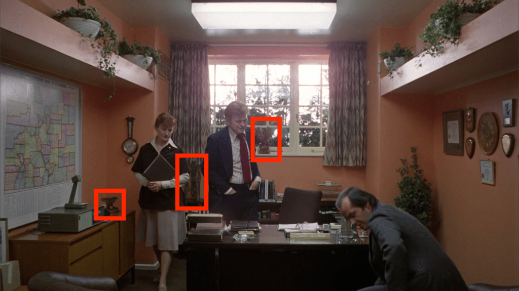 Also, as for the weird animal-shape sculpture, recent inspection helped me see that it seems to be made of some kind of linking material. And I’m wondering now if these are railroad spikes that have been fused together to look like an animal. There’s a railroad subtext to the film that gets one of its biggest jolts in the scene immediately following the interview.