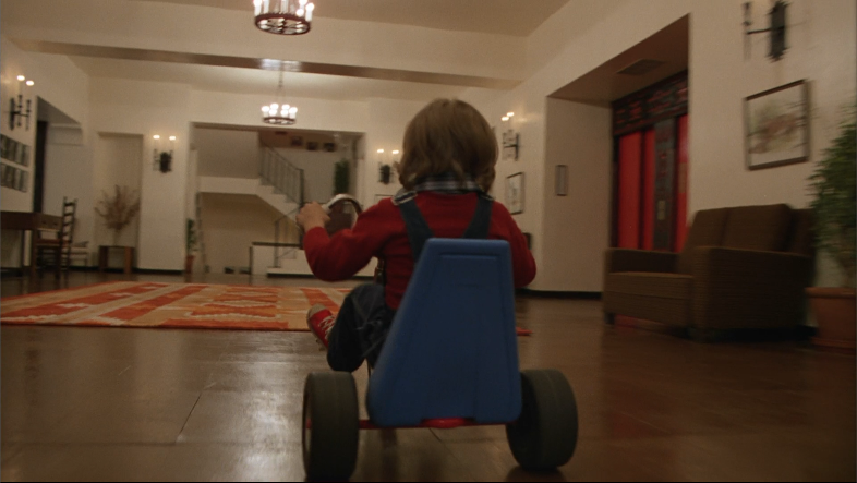 When it’s beside triking Danny, Wendy is saying to Tony/Danny, “I’m just gonna go talk to daddy for a few minutes. And I’ll be right back.” It’s possible we’re meant to think of the rabbit in concert with the spaniel and the deer/caribou head to come. As a trio they might speak to Tony’s attitude toward what Wendy’s saying here: the gentle rabbit is going to go after the birding dog and the horned buck. Good luck, Wendy!