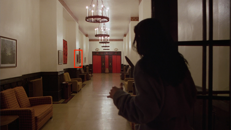 Down the hall when Jack’s heading to Ullman’s for the interview, and in every other shot of this part of the hotel until…