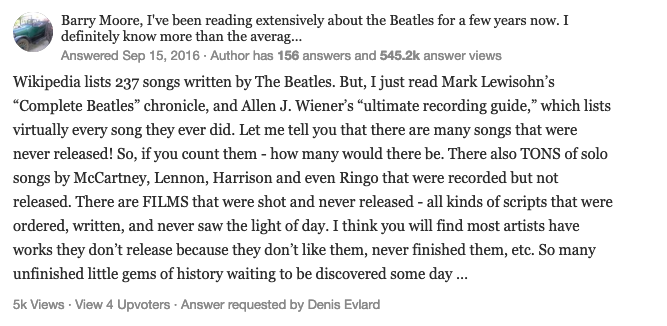I’ve seen a lot of different numbers thrown around for their total compositions, but at least at one moment in time, the official number of original Beatles compositions was 237.