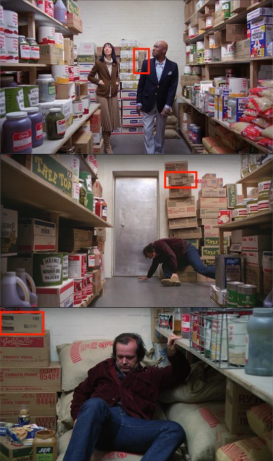 There’s a box that appears three times in the film, and it’s the only box with a date stamped on it, which happens to be Dec. 13/77. Film Jack might die on the evening of Dec. 13th, 1979, two years to the day, following (if not the evening of the 13th then definitely the morning of the 14th). This has caused me to wonder if the box is simply a reference to when Kubrick imagined Jack in the books to die, since the novel came out in 1977, and context clues would lead one to suspect the events were taking place in October-December of 1977 (Danny’s born in ’72, and he’s supposed to be 5 years old).