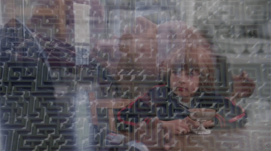 - The rapid, exciting music carries on beautifully all the way through the aerial lift off created by the backwards action here, drawing to a close as sane tennis ball Jack finishes his stroll away from the model labyrinth. But what I love about this image is how it suggests the reality of what Jack’s thinking here. She just clubbed him atop a staircase that happens to perfectly resemble the labyrinth from above (see below). We don’t know exactly where Jack sat down and died, but it’s in one of these corridors, so he might be overlaying with the actual location of his death. So, pantry Jack might be thinking, “Wait, if you lock me away…I’ll die!” Ironic, since she’s actually cutting herself off from the majority of the sustenance. Meanwhile, forward Dead Wendy is entering the lounge to do the clubbing, and is right here looking up at the spot where she’ll do the clubbing, as she walks backwards for a few seconds. Danny will walk backwards to trap Jack in the maze heart. And in the ice cream world, Danny is confirming to Hallorann that Tony is the one who “tells him” things. And possibly the most important thing he tells Danny is REDRUM, a mirror phrase, to help Danny think in terms of backwards and forwards. A phrase he’ll be seeing for the last time in just a few minutes.