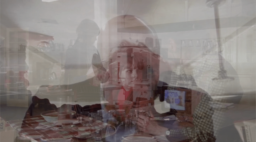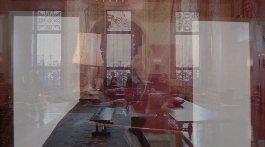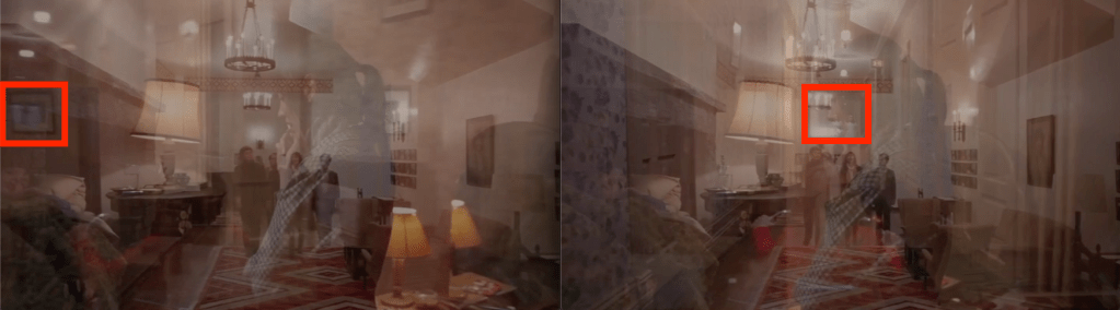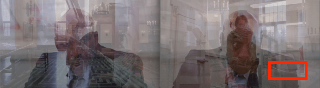 - Also, it’s hard to make out in this shot, but one layer of this image is the giant head of Danny, who’s talking to Tony after having just survived the Grady twin vision. Tony’s telling him that it’s just like pictures in a book, and that it isn’t real. The shape and size of Danny’s head is encompassing every other character in this moment. So, if we’re meant to be holding on to this idea of of Danny’s “very great talent” being connected to the idea of storytelling and filmmaking, perhaps there’s a subtle suggestion here about people like Kubrick and King who bring all these characters in all these moments to such vivid life.