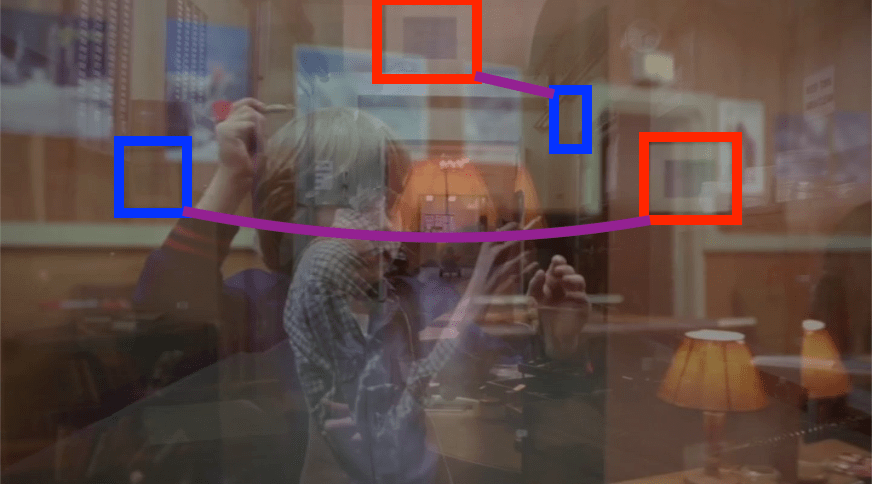 - “People stare” On this line we’ve got both sets of Grady Twin Paintings on screen at the same time, but they’re hard to see, so I square them up–red for the snow and horse painting and blue for the Arnegger piece on the Austrian Kaiser mountains. But the reason they’re in opposite order on opposite sides of the Twice-Folded Shining is because the blue one over a REDRUMing Tony/Danny is actually in the makeup mirror, while the ones beside escape plan Wendy are being seen straight on. But yeah, not only do “people stare” and not only is he “aware”, but those eyes are like mirror eyes, like a Cheshire cat’s eyes, rolling and inverting.