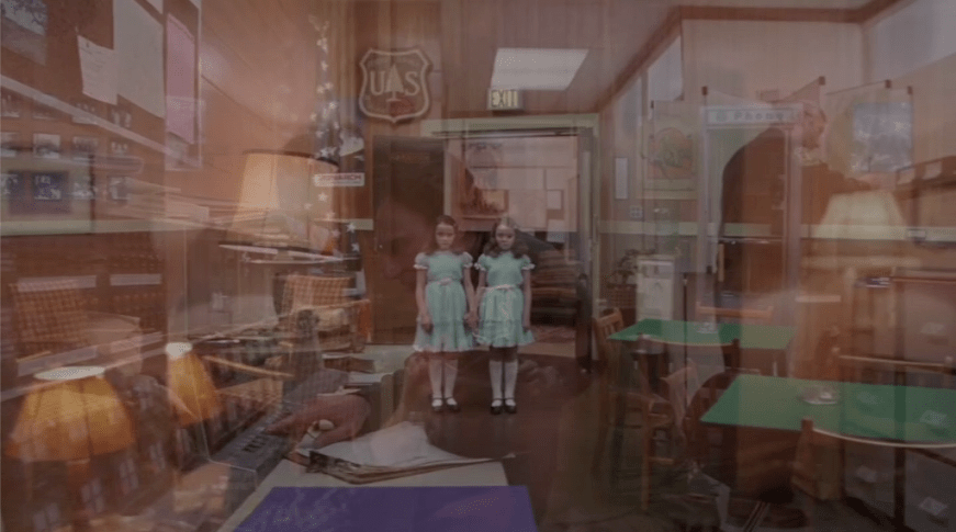 - One really cool thing is how, as backwards Dead Danny trikes away from the Grady twins, the paintings I call the Grady Twin paintings are passing by Forward Dead Wendy’s head, as she plots her (failed) escape mission. So, right as Danny starts to turn away from the twins, they’re overlapping with the one painting, which is right behind Wendy’s head there, and right as they’re about to vanish off the screen they overlap with the other painting for a split second. 5 seconds later, the shot cuts to Danny in the games room, with the twins probably behind him, but definitely with two sets of Grady Twin paintings flying around in both the Quick and the Dead halves. Actually, these are the first and last scenes that those paintings appear in (from their position in Suite 3–they do appear elsewhere in the hotel) so it’s kind of amazing that they would float atop each other, and at this crucial moment where we’re about to go from Danny’s first to his last physical encounter with the twins. Twins are flyin’ all over the place!