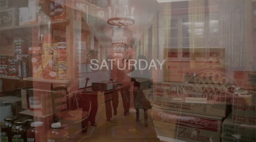 - Saturday is named for Saturn, who, among many things, was the god of wealth and harvest. So it seems perfectly apt that this name would appear along with the Gold Room and the storeroom. Not to mention that the Gold Room sign is wedged between two boxes of Golden Rey. But also, it’s overlaying with the middle box of “SLICED PEACHES” and forward Q Wendy is here saying, “Well, he sure did a wonderful job. Pink and gold are my favourite colours.” Forward Q Jack is about to get very bashful as Wendy does a little dance in the Gold Room, so maybe pink is “bashful” and gold is “grumpy”, since storeroom Jack is very that.