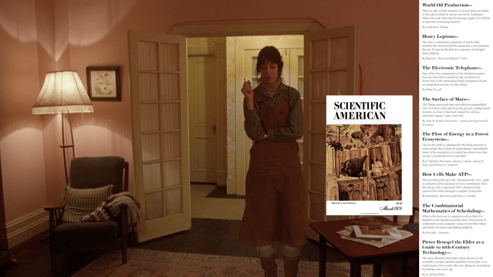 So let’s return to Kubrick, who selected an issue that had, at page 42, an alarming report about global energy demands. How this plays into the Tower of Babel concept is perhaps rather obvious, but I think it also speaks to the hotel’s luring Jack into believing that everything in the past was always consistently great and sublime. As discussed, it’s actually terrible at presenting the past accurately, so it’s a testament to Jack’s idiocy that he buys into the presentation and the premise. This article, which exists thanks to science, is projecting a rather bleak picture of an hourglass rapidly losing sand. While it might have been wrong in its specifics, it way underestimates the severity of the impact for what it was right about.