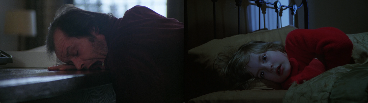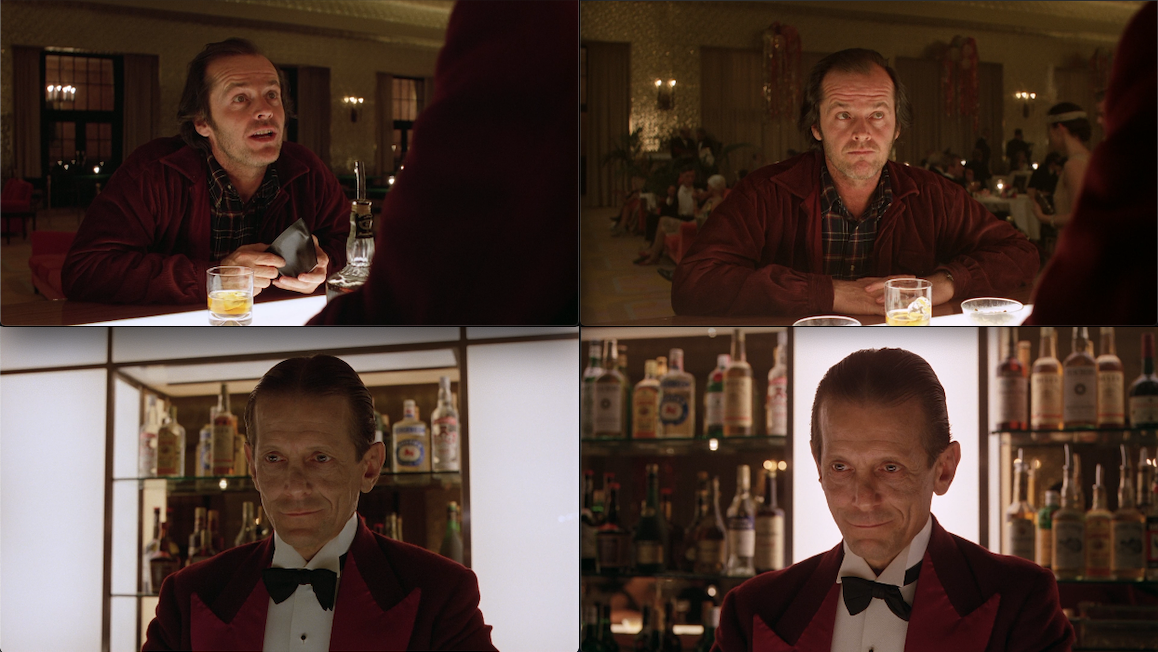 Same with the two Lloyd scenes, which are relatively identical (though the slight changes are striking–like the lighting behind Lloyd going from an enclosure of light to a column of light, which probably speaks to how Lloyd at first mirrors most of Jack’s speech, then blocks his attempts at mirroring, as discussed in the mirror phrase analysis).