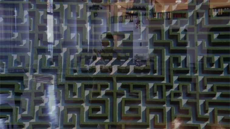 - “I don’t wanna leave her now/You know I believe in how” – Transitions between Suite 3 and the lounge fight, and in the mirrorform, between the heart of the labyrinth and the aerial view. Wendy’s not wanting to leave Suite 3 is obvious, but the idea of the labyrinth being analogous to the world plays well with this line, in light of all the moon imagery from just before. Danny’s just been tempted to make a flight to the moon (237), and here, in the (backward) slow zoom perfectly straight up off the centre of the maze, we get the feeling of leaving earth. This might actually account for all the 11s that appear above Wendy in the gallery above the typewriter (which you can see along the top of the screen here). Apollo 11.