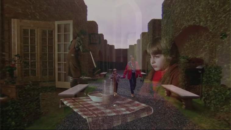 - In the interlude, two things: 1) Tony/Danny has his one line of dialogue (“Yes, Mrs. Torrance”; in round 2 he also had one line in this passage–“Can I go to my room and get my fire engine?”–which lead him right to where Tony/Danny is now, staring at a similarly zombified, similarly dressed Jack sitting in the same spot), and 2) in round 1 of this moment, the backward bloodfall (seen by Wendy) was sucking back up along Ullman’s person, just as backward Wendy’s fruit cocktail is sucking back into the can, here.
