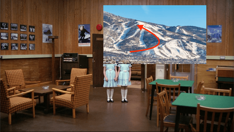 In the novel, the Torrances live on Arapahoe Street in Boulder, which gets a mention in chapters two, four and seven. The name is a European exonym for several bands of indigenous people of the Colorado area. It’s believed to come from the Pawnee word for trader. The resort was founded in 1945 by Larry Jump and Max Dercum. It may be coincidence, but that reminds me of Larry Durkin, Dick’s trader friend who provides the life-taking/life-saving snowcat. Dick rides a 10-10 plane to get there, which may be referenced in the MONARCH poster across the way here. The National Western Stock Show posters also links to the concept of blackface, which would remind of the roles Dick and Durkin play in the film. And the Steamboat Springs poster of Steamboat Willie (Mickey Mouse), who will appear on Danny, and who bears a certain resemblance to black minstrel motifs. That would just leave Remington’s Cowboy, which reminds of how Danny will defeat a certain minotaur in order to make his way back to that snowcat.