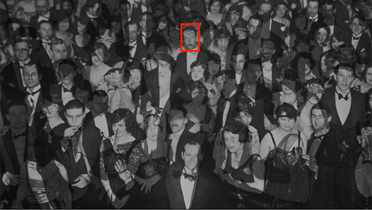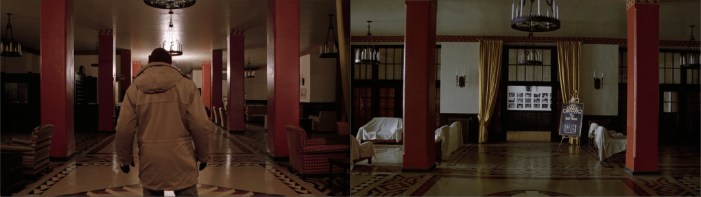 In fact, the shot of the final photo (which lines up with Jack’s stare here), lasts for 97 seconds, and in that same amount of time, we see Hallorann walk all the way through the lobby to his death, get hacked, and then Jack make the stalk from the killing spot to the end of the hall that he’ll spy Danny down. So, he veers off from the final photo eyeline at the last seven seconds, but consider too that the 97-second shot of the final photo includes over 30 seconds of the intense close-up. The major point is, both Section I and Section VI spend a considerable amount of time moving up and down this lobby path (actually, a quick survey has revealed that only Section IV doesn’t feature someone or something moving up or down the path toward the photo Jack spot–Section VII isn’t obvious about it, but the staff are seen moving up and down that channel behind Watson and Ullman).