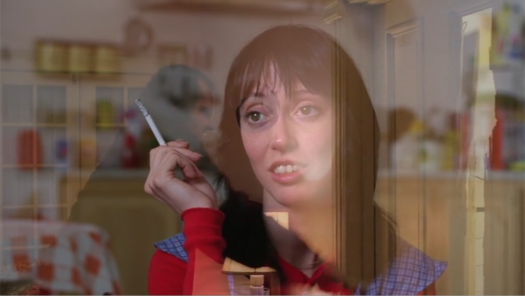 The backward action is three seconds away from Jack’s final words to Wendy (and the film’s last Carson reference, remember), dividing the Wendy who will ever have anything to do with Jack again, from the one who will slash him with a knife to save her life. And 17:11 (the spiral cut) specifically draws attention to one of my favourite overlap effects: Wendy’s secret black eye (formed by a slanted landscape painting). It’s only on screen for 6 seconds, and for the line “on this particular occasion my husband just used too much strength” and you get that horrible feeling of knowing there’s an ocean of women who’ve made similar excuses over the centuries.