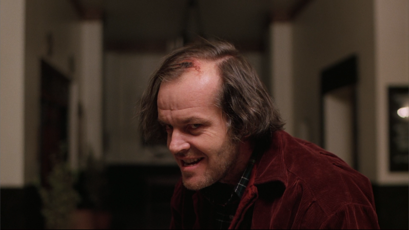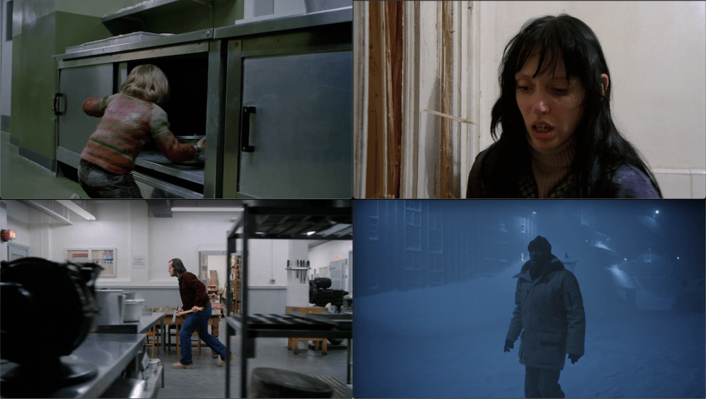 Another interesting inversion: Wendy is freeing herself, while Jack is sealing his fate. The back half involves Wendy getting stuck in the bathroom, then freeing herself by slashing Jack, and then using the knife to slash open the jammed door handle. Jack finally succeeds in becoming a murderer, killing Hallorann; the first thing he does afterward is stare at the spot where his photo will forever hang.