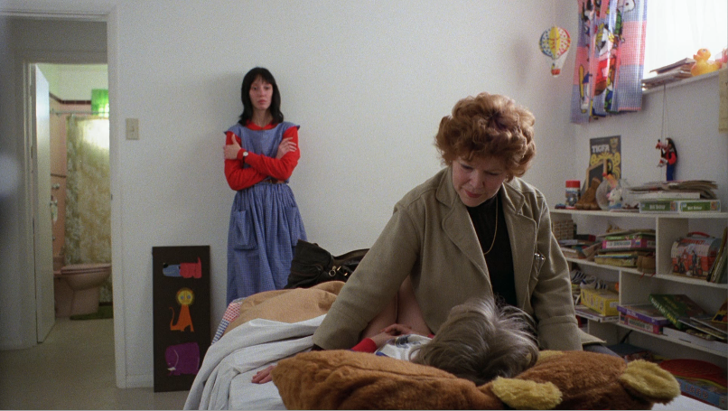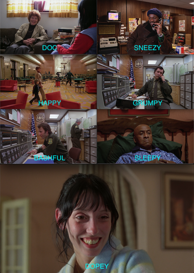 Actually, if Danny is Snow White, wouldn’t he have seven dwarves? The seven characters who perform actions that help Danny survive his story are the doctor, Susie (Ullman’s secretary, who returns Danny to his parents during the tour), the two forest rangers, Larry Durkin, Hallorann and Wendy. The two most obvious would probably be Wendy, who’s seen directly after the Dopey sticker goes by, and the doctor, who is a literal doc. Hallorann is the only person in the film being sleepy, and the older ranger is the only person seen being grumpy. The younger ranger speaks to Wendy in a way that seems arrogantly dismissive, but he also looks down, and talks into his chest, and purses his lips at the end of sentences, so, between the remaining three (Sneezy, Happy, and Bashful) that sounds the most like Bashful to me. It’s unclear exactly who, between Susie and Durkin, would be Sneezy or Happy, but Tony Burton talks with an unmistakably heavy nasal tone, so I’d give him Sneezy and Susie Happy, since she says everything with a doe-eyed smile.