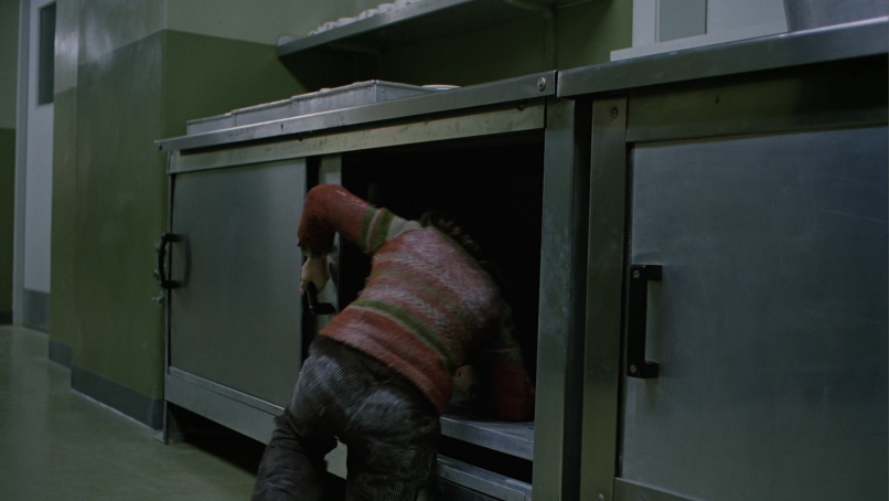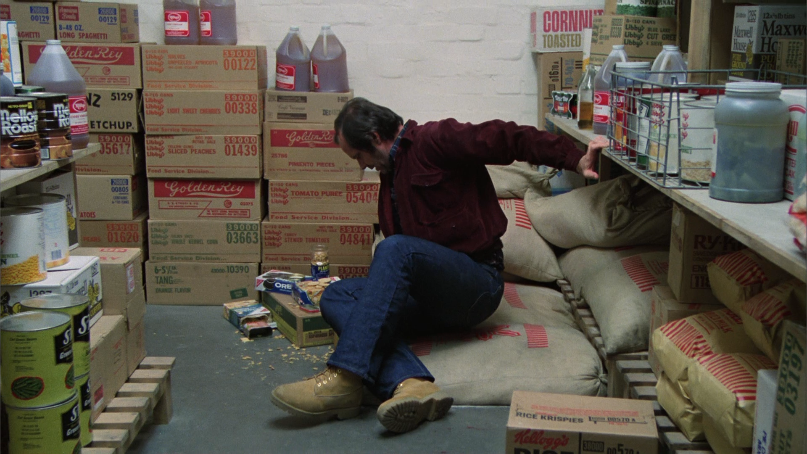 Right after Wendy “revives” Danny, she pushes him out the window, and his next move (dusted with snow), is to run and hide in a steel case.