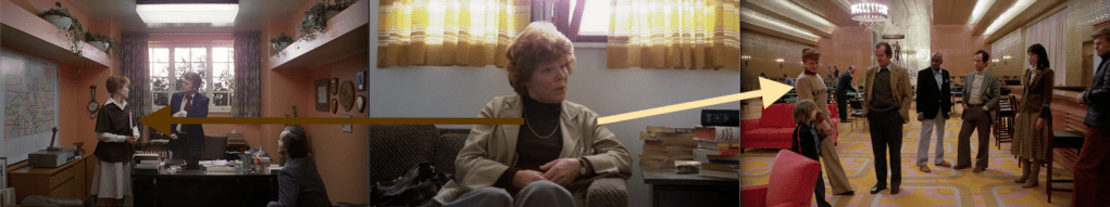 It next appears beside Wendy as she creeps to see Hallorann’s corpse, vanishing at exactly 9:06 of the mirrorform (Ullman is wrapping up the Grady story on the other side), one second before the 9:07 mark. There’s also a lot of yet-unidentified art in this hall, so there might be a bit more to connect to this moment someday.
