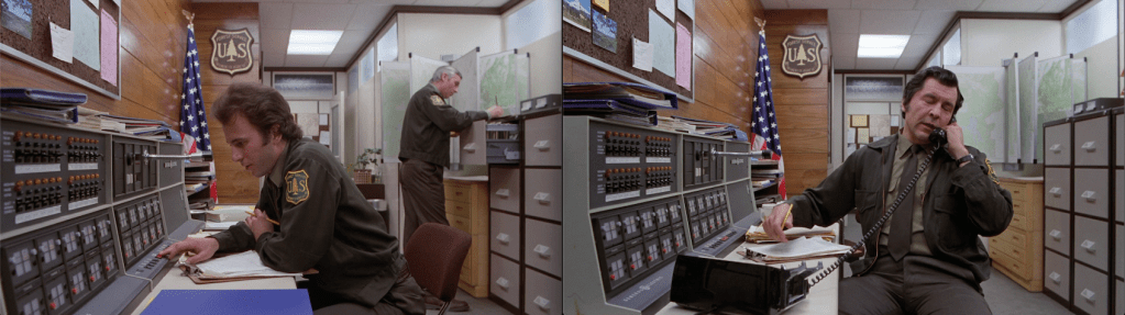 Speaking of wicked witches, the mirror action for the Durkin scene is Danny finding room 237 for the first time and touching the door knob, which summons this vision of the Grady girls (standing next to that 1839-1842 painting, remember), and not getting to see the hotel’s wicked witch. In this mirror moment, Durkin is putting the phone back down, which means his hand is going toward Irene Reid again, and the shot is transitioning to Dick driving his Buick to the rescue, and the licence plate reads TG4247. And 42:47 is the exact second of the forward-moving film that this transition begins (technically, Hallorann’s car fades out at exactly 42:47, as if even his car knows how doomed he is). The time on the other side is 1:38:45, another 1854 jumble, perhaps.