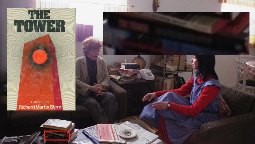 Oh jeez…somehow I’d overlooked this. The Towering Inferno was actually based off of two different novels with very similar premises. The other was The Glass Inferno, by Thomas N. Scortia and Frank M. Robinson. I’m honestly not sure how many times something like this has happened in the history of film, but I’m thinking it’s probably extremely rare. The Tower came out first, so perhaps Kubrick’s inclusion of it over the other says something about the former’s legitimacy as a singular, inspired work of fiction (the proximity of these publications suggests a twinning, at least). Perhaps it’s simply being used to highlight the twinniness of art.