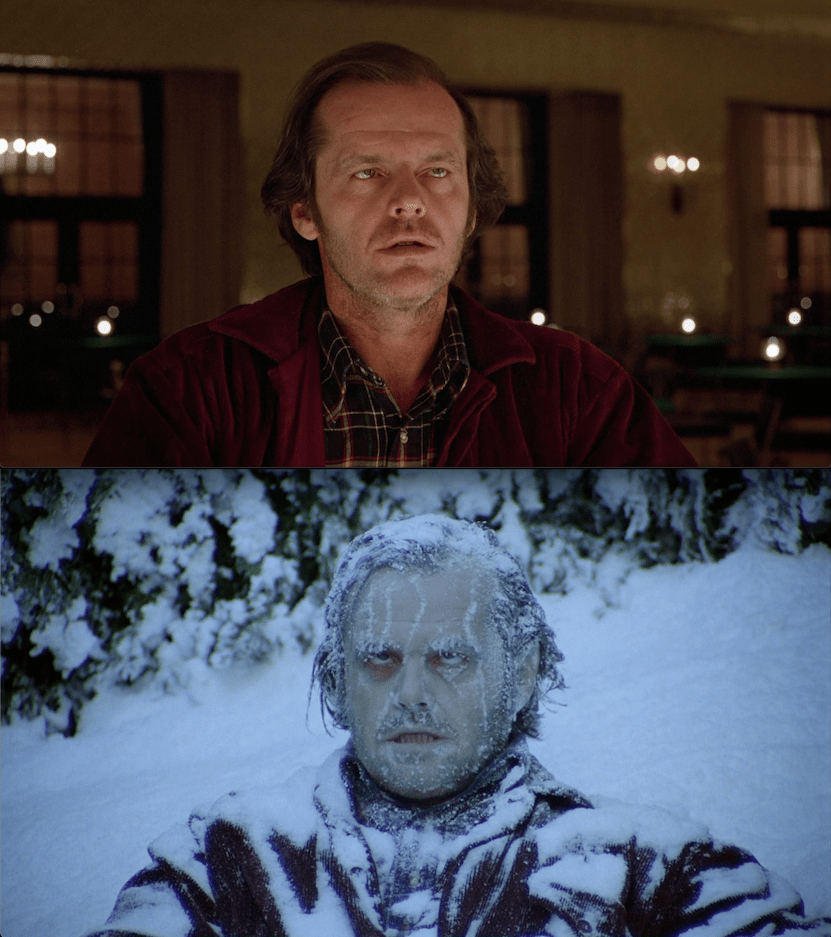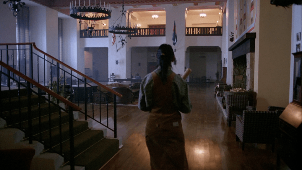 A similar trick is pulled when Wendy sees Hallorann’s corpse. In the first shot of him, we only see the “hell” photo ahead of Wendy. Then we see Wendy’s horrified reaction. Then we cut back to this shot which gives us just a sliver of “heaven”, and half-cut “hell”. Since Hallorann’s corpse will have vanished by the next shot, I like to think of this as a comment on the uncertainty of Dick’s fate. Like, I think the hotel definitely absorbed his physical form into its essence, but perhaps his force ghost got to go some place else.