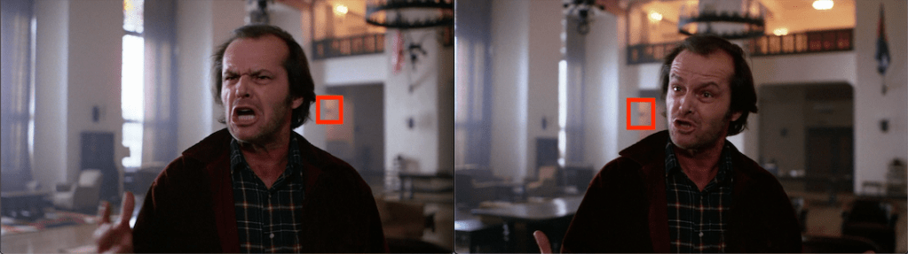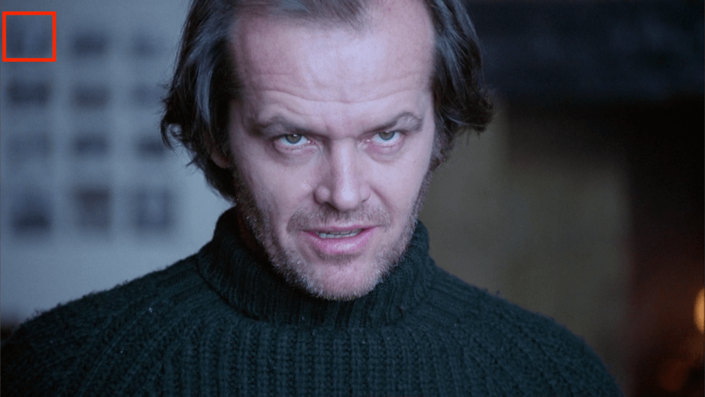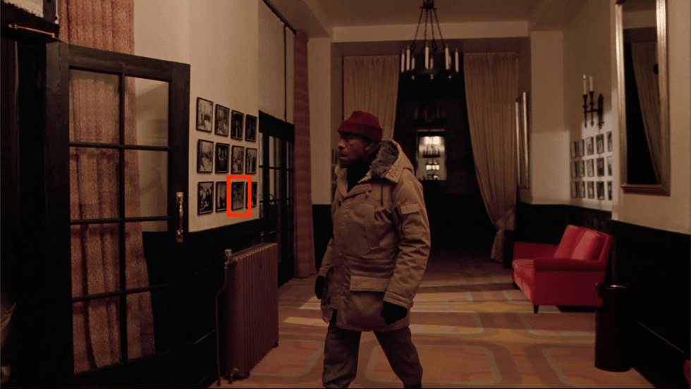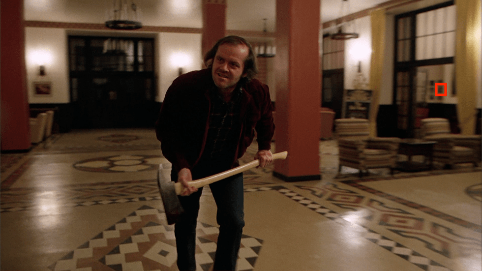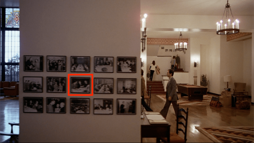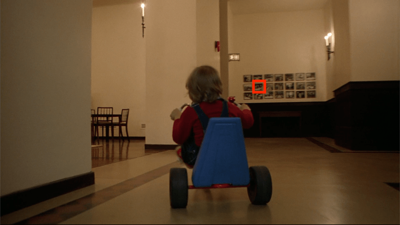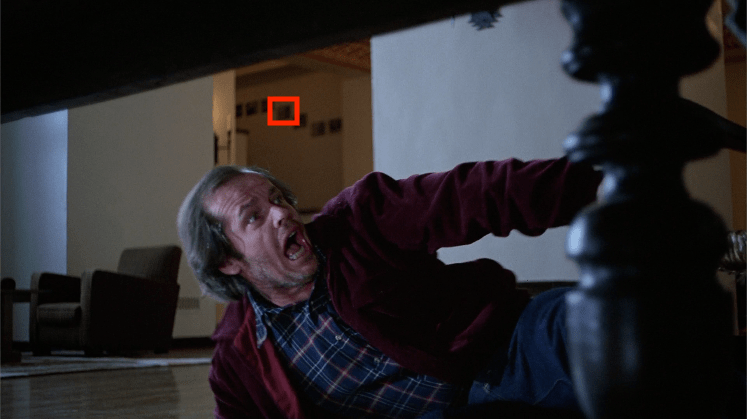 So the first thing I did was to look at where the photos appeared and how they behaved. The first place the pic appears is in the stairwell overlooking Jack as he approaches the interview. He’ll seem to be looking straight at it at 3:27 into the film, as he’s crossing the spot where he’ll axe Dick.