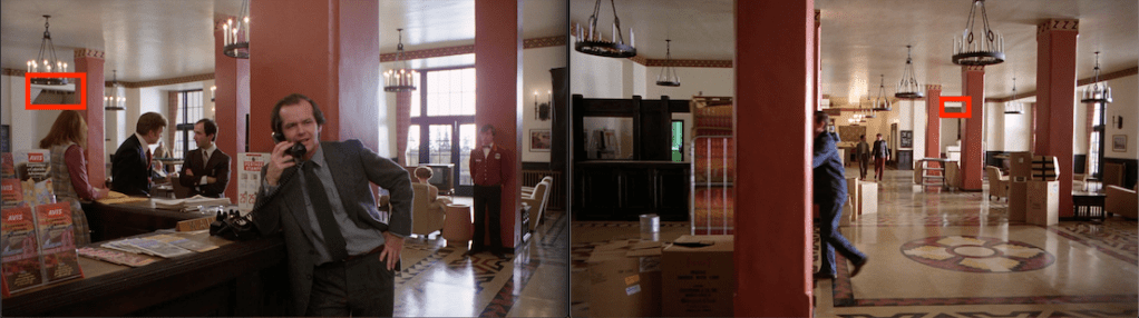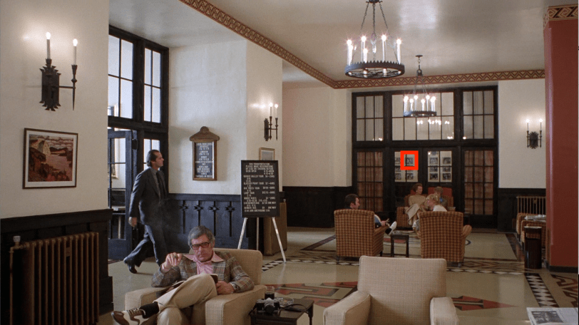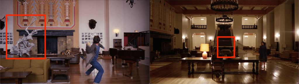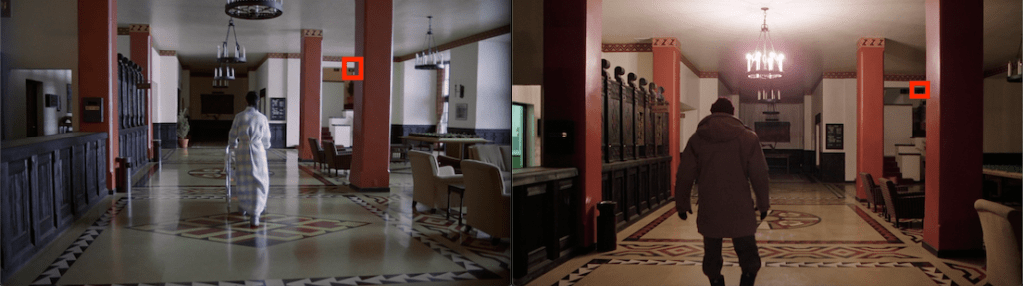 This spot will be seen 8 more times in the film, during moments like Jack phoning Wendy about getting the job, and the opening shot of Jack’s first day on the job. Wendy bringing breakfast in the first interior shot following the shut down of the hotel. Hallorann approaching his death. Stuff like that.