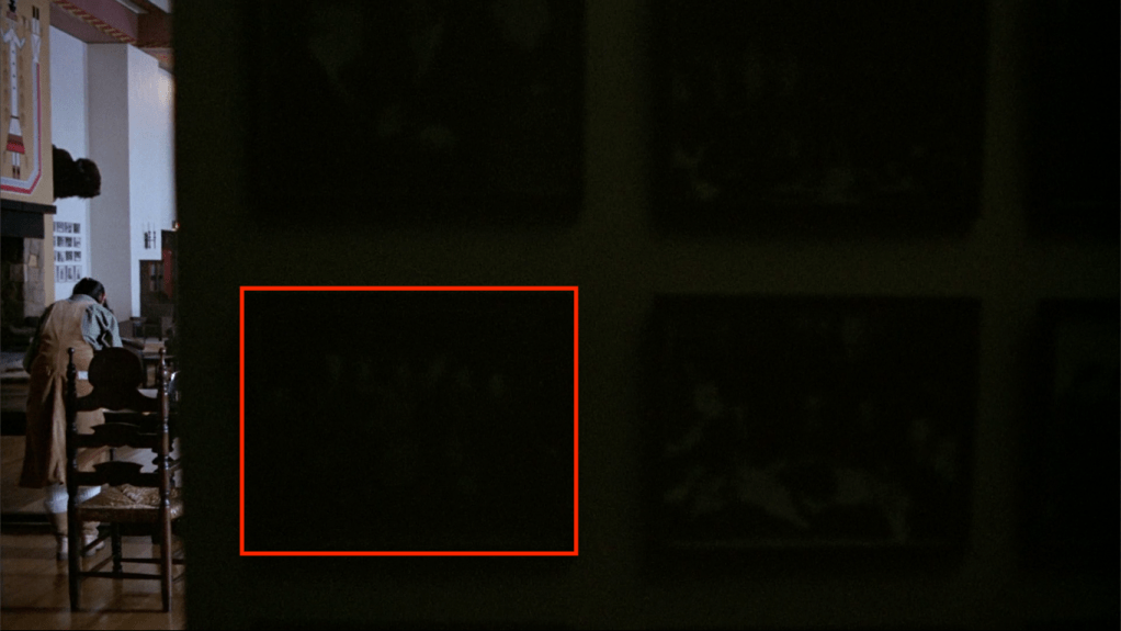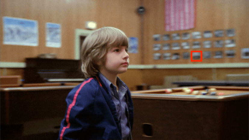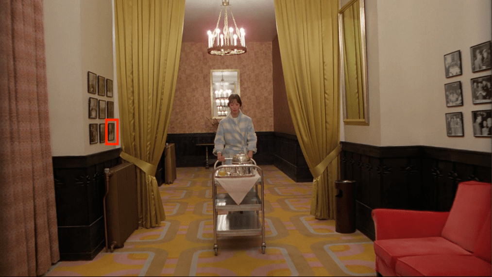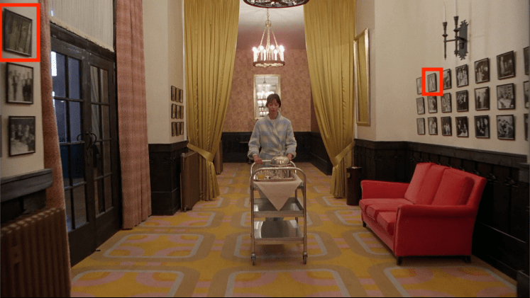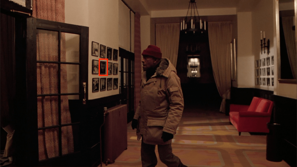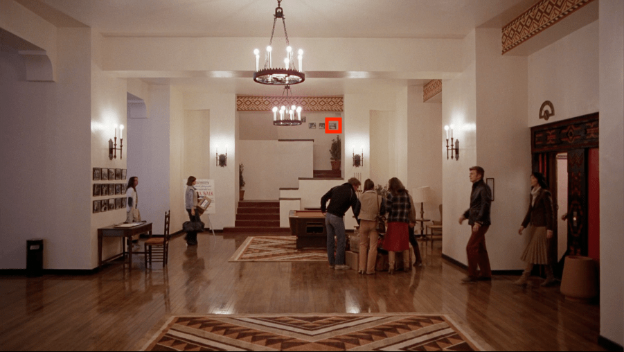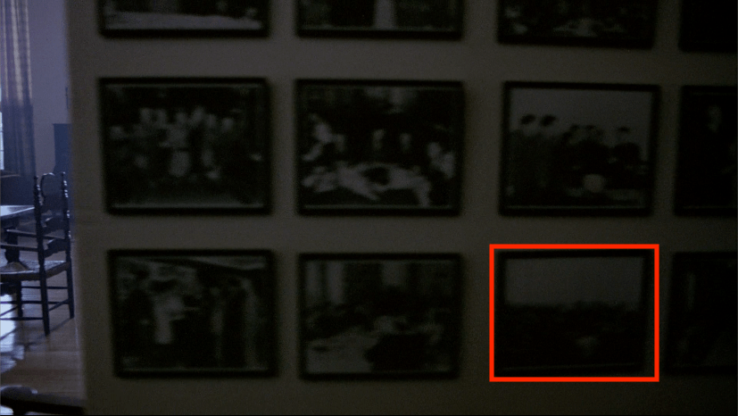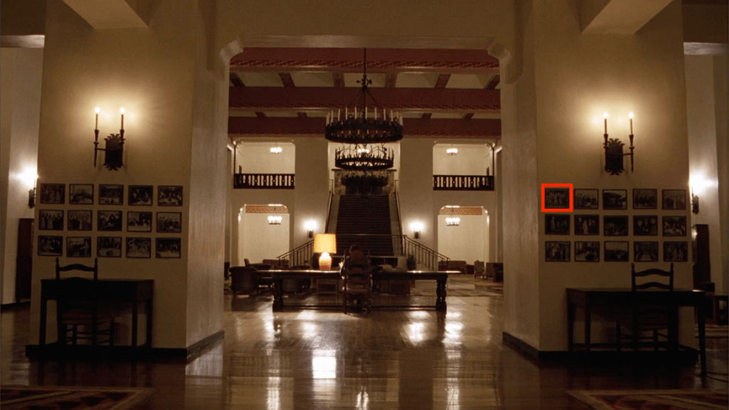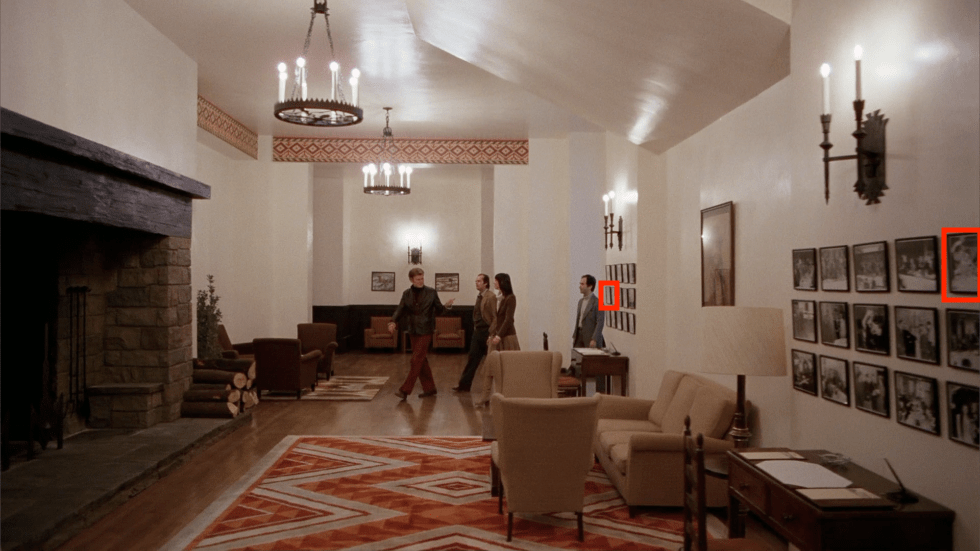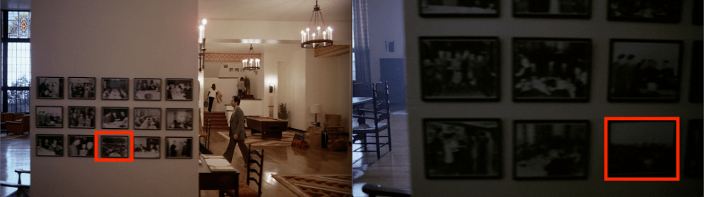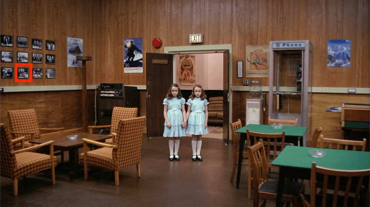 And before we get into the nature of the photo in the film, just a note on this idea of twins. It’s hard to know if Kubrick deliberately chose photos that are hard to tell apart, but part of the hell of figuring out this final puzzle was in the way that so many of the roughly 100 photos he used to express this code look like one another when they’re blurry. So, in the case of the southernmost west-facing part of the lobby’s path to the Gold Room, note how the photo in the red box below looks like the 17-value photo when it’s blurry, but not when it’s not. When it’s not blurry, they really really look nothing alike. And scrutiny will reveal that they are not the same. But also note how the brown box below is the 17 value, and is never seen wholly or clearly in the entire film. This is actually the best, most verifiable view of this photo, so on the one hand, if you’d only done a fleet-footed analysis, you might’ve made this mistake, and you wouldn’t have ultimately been wrong that there’s a 17-value here. And on the other hand, if you went back and rechecked but didn’t look for this one frame when the 17 is visible, you might’ve written it off. This happened to me enough times to bring tears of confused frustration. Was that the point? To frustrate a potential pattern-seeker out of trying to crack the code?