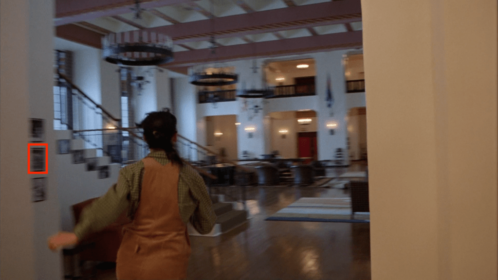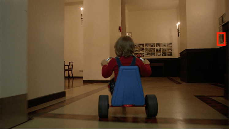 Then, for the last time, a second later, as Danny’s passing the southwest stair. The low angle of this shot allows for this final 1-value to appear as the fourth photo up the stair there. In the scene of the tour, or of Wendy coming to fight Jack, the higher angle cuts off this 1 from sight.