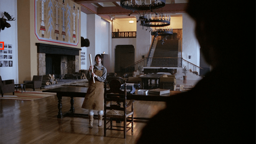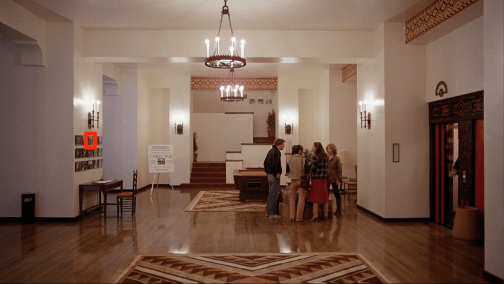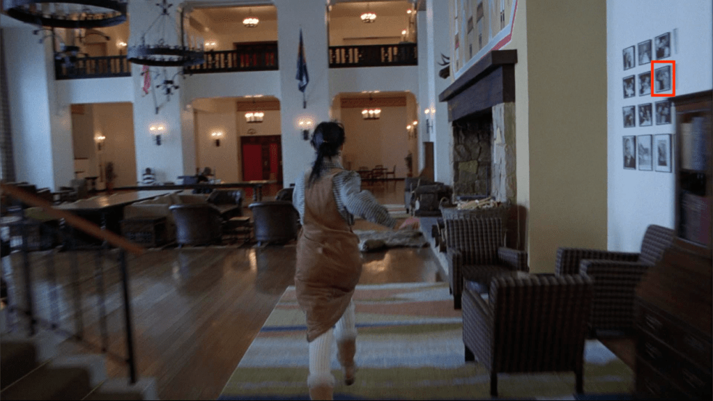 The next time we see it, Ullman is saying “This old place has had an illustrious past.” While two workers are seen, one of which blocks the photo as the shot continues. This location is seen three more times: 1) as Wendy runs to wake nightmare Jack, 2) as lounge fight Wendy backs up the stairs, and 3) as defeated Jack tumbles down the stairs.