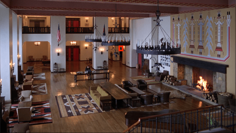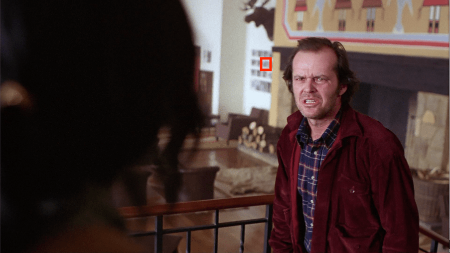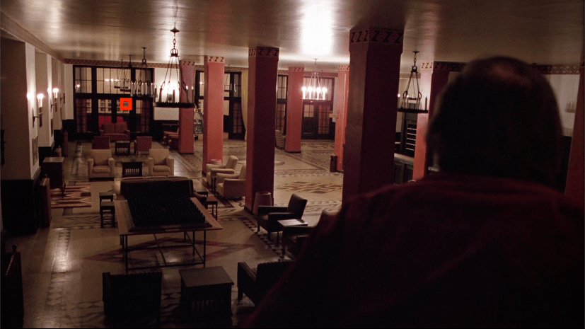 Another cool bit: the other thing this forward motion reveals is the painting of Maligne Lake, Jasper Park, which resembles the opening shot of the movie, but also contains a reference to a Samson Peak. So, on the one hand “heaven” is appearing in tandem with “Samson”, and the view of Samson looks a lot like our first look at this movie. So perhaps the allure of “heaven” is the allure of “going back to the beginning”. And if you recall that the wall ahead of Jack here is the one where that “hell” photo appears mid-movie, this is the first shot that it’s seen in, behind the glass door. So there’s a heaven/hell thing going on. Is the ghost ball heaven? Or is it hell?