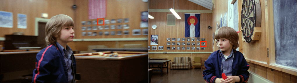 I should mention that this spot on this wall is seen many other times in the film, perhaps most interestingly in the moment when Jack notices the ghost ball. In the first moment of this shot, the 4 and 16 are hidden by a pillar, meaning that the visible total between the two wall portions in that moment add up to 37, a spooky number. But as he moves toward the ghost ball, the 4 and 16 appear thanks to the motion, and the 2 disappears, making a much less alarming total of 20 on the left and 35 on the right, for a combined 55. Actually, we’ll see later on in a section I call There’s No Place Like Home, how this 20-35 might be something like the 20-34 combo that holds a very special place in Jack’s heart.